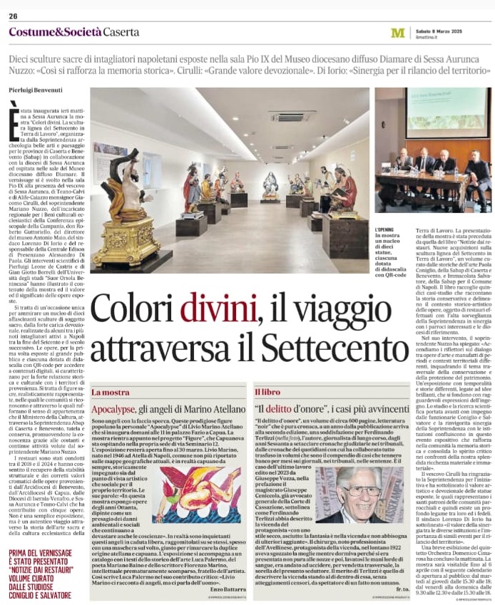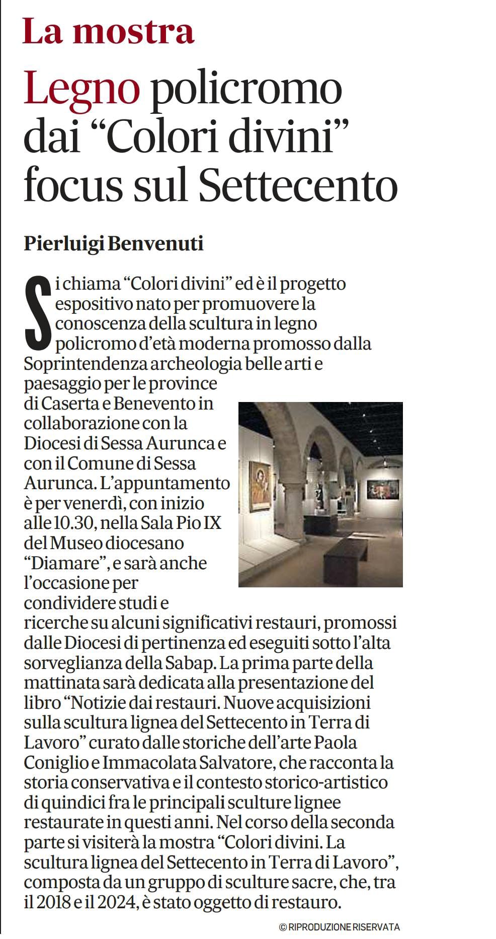 La Soprintendenza Archeologia belle arti e paesaggio per le province di Caserta e Benevento, in collaborazione con la Diocesi di Sessa Aurunca, invita all’inaugurazione della mostra “Colori Divini. La scultura lignea del Settecento in Terra di Lavoro”