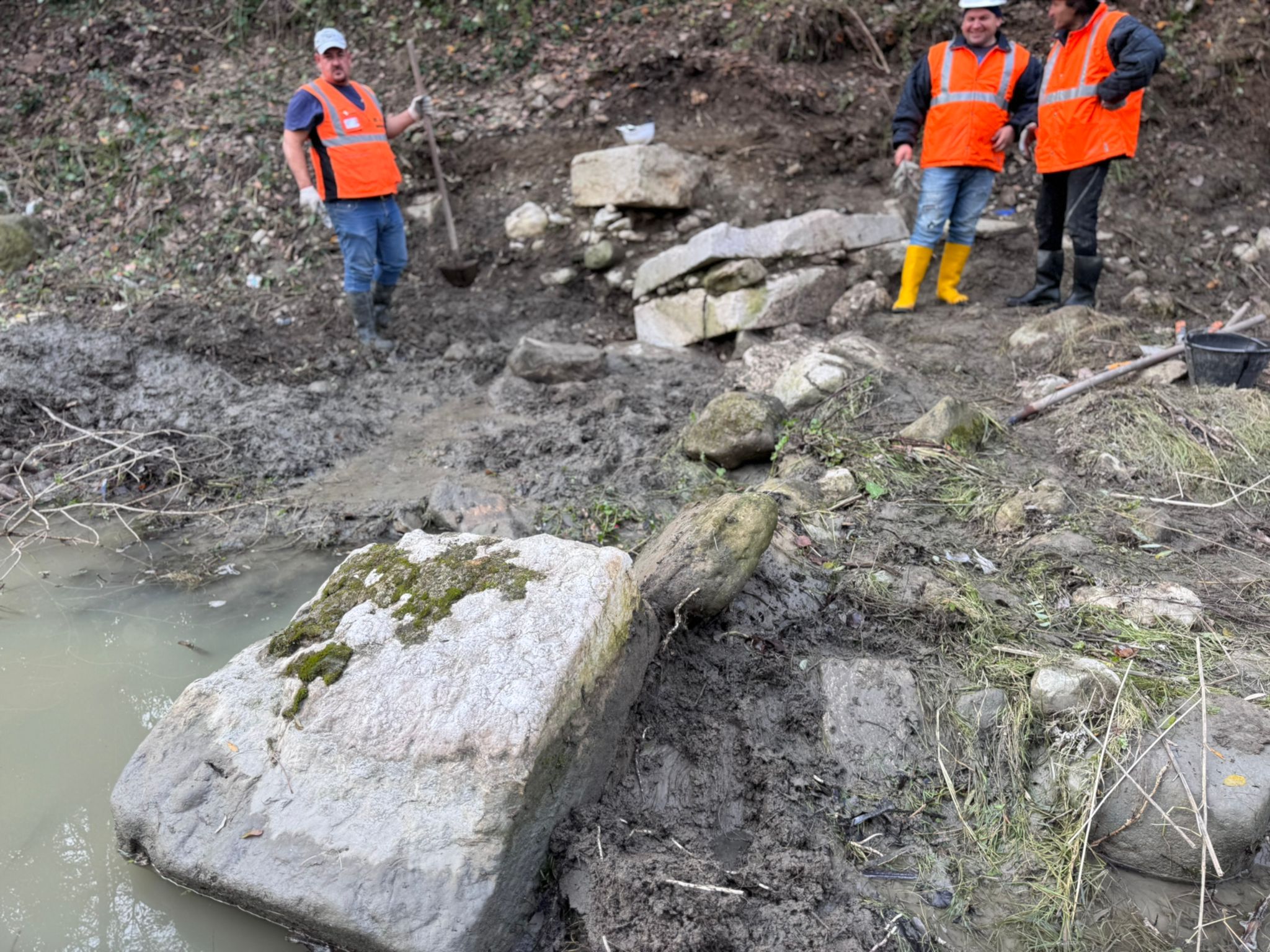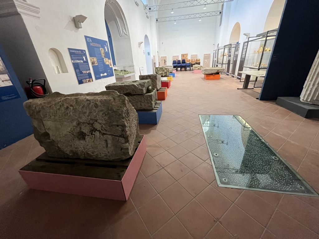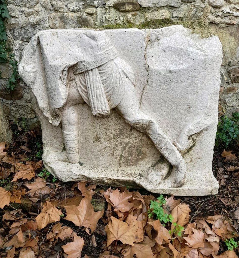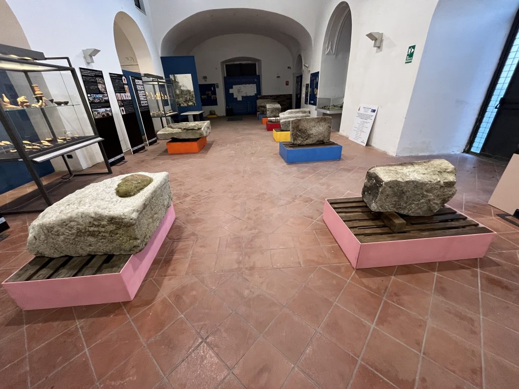 Nel settembre 2021, in seguito all’esondazione del torrente Serretelle nel territorio comunale di Apollosa (Benevento), è stato individuato un monumento funerario romano decorato con scene gladiatorie, databile ai primi decenni del I secolo d.C. Il mausoleo, smontato e reimpiegato in età medievale in un muro di contenimento degli argini fluviali, fu originariamente edificato lungo il tracciato dell’Appia che da Caudium conduceva a Beneventum. Dopo un primo recupero d’emergenza, nel 2025 – grazie ai fondi per progetti di ricerca del Ministero della Cultura – è stato possibile riportare alla luce circa 40 blocchi in calcare pertinenti alla struttura e programmare un intervento di ricomposizione del monumento presso la sede della Soprintendenza a Benevento. Il mausoleo, a tamburo su base a dado quadrangolare, presentava un diametro di circa 12 metri. Le cornici modanate e lo stile dei rilievi figurati consentono di datarlo ai primi decenni del I secolo d.C. Di particolare rilievo è il fregio con lo scontro tra tre gladiatori: al centro si riconosce un gladiatore di tipo sannita, identificabile dallo scudo ricurvo rettangolare, dai polpacci fasciati e dal cinturone decorato con motivi vegetali che trattiene il perizoma, nell’atto di affrontare un avversario munito di scudo. La presenza di una seconda figura suggerisce un ulteriore duello raffigurato nella scena. Il committente, verosimilmente un organizzatore o finanziatore di spettacoli gladiatori, volle così celebrare e tramandare la memoria dei combattimenti svoltisi nell’anfiteatro di Benevento. Le ricognizioni nell’area hanno inoltre permesso di individuare la camera funeraria, composta da vani quadrangolari affrescati, che sarà oggetto di prossime indagini archeologiche.