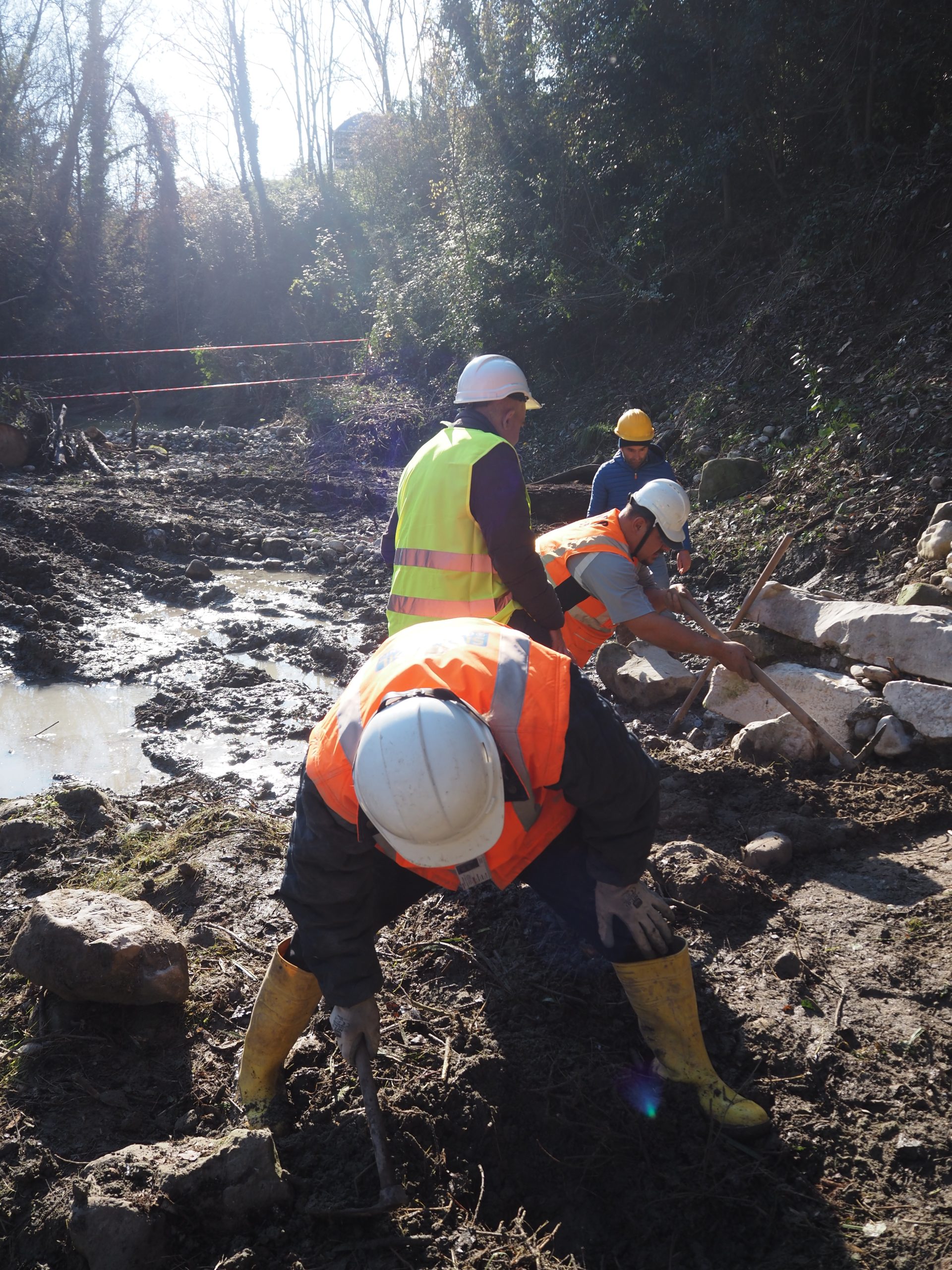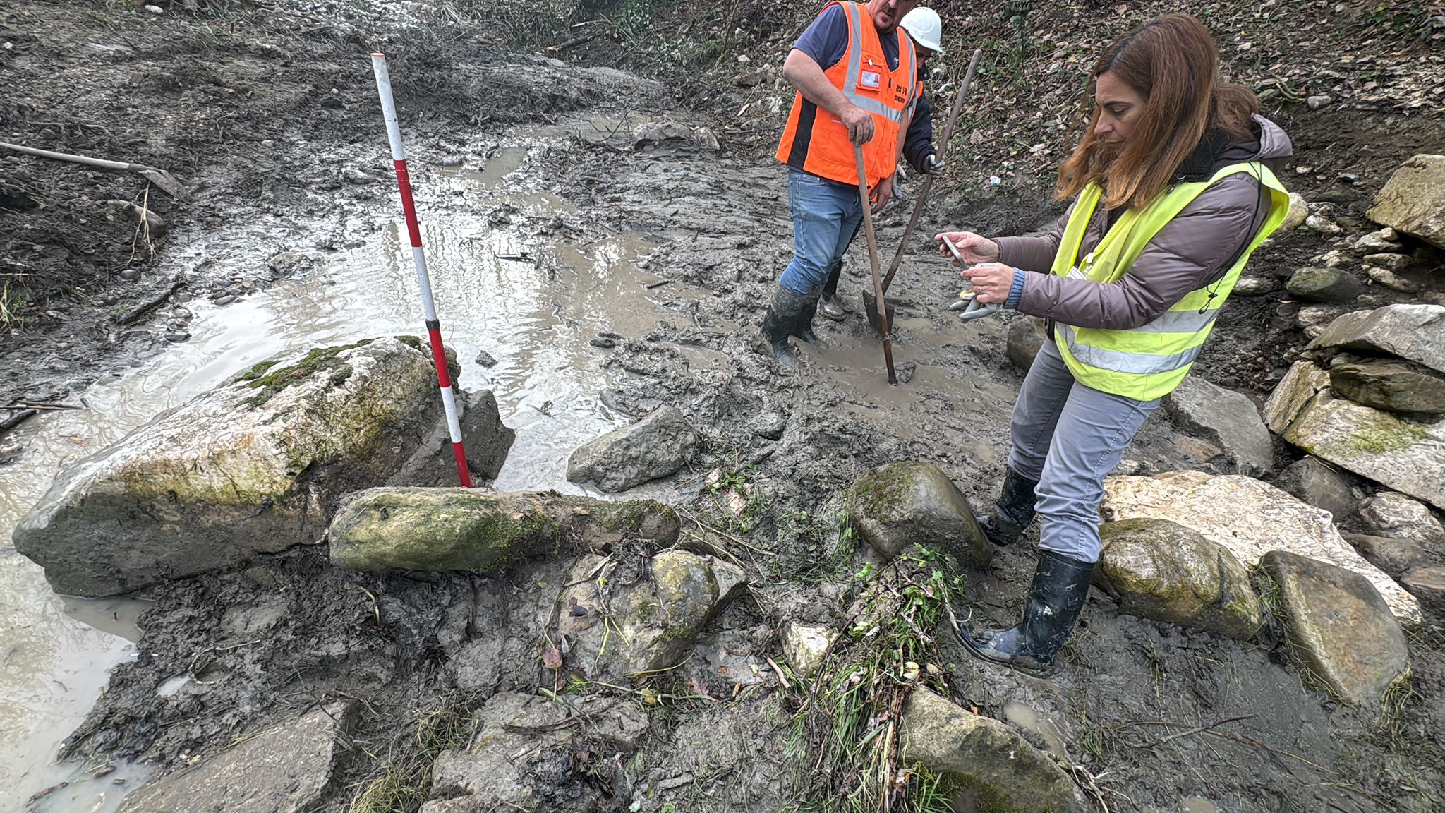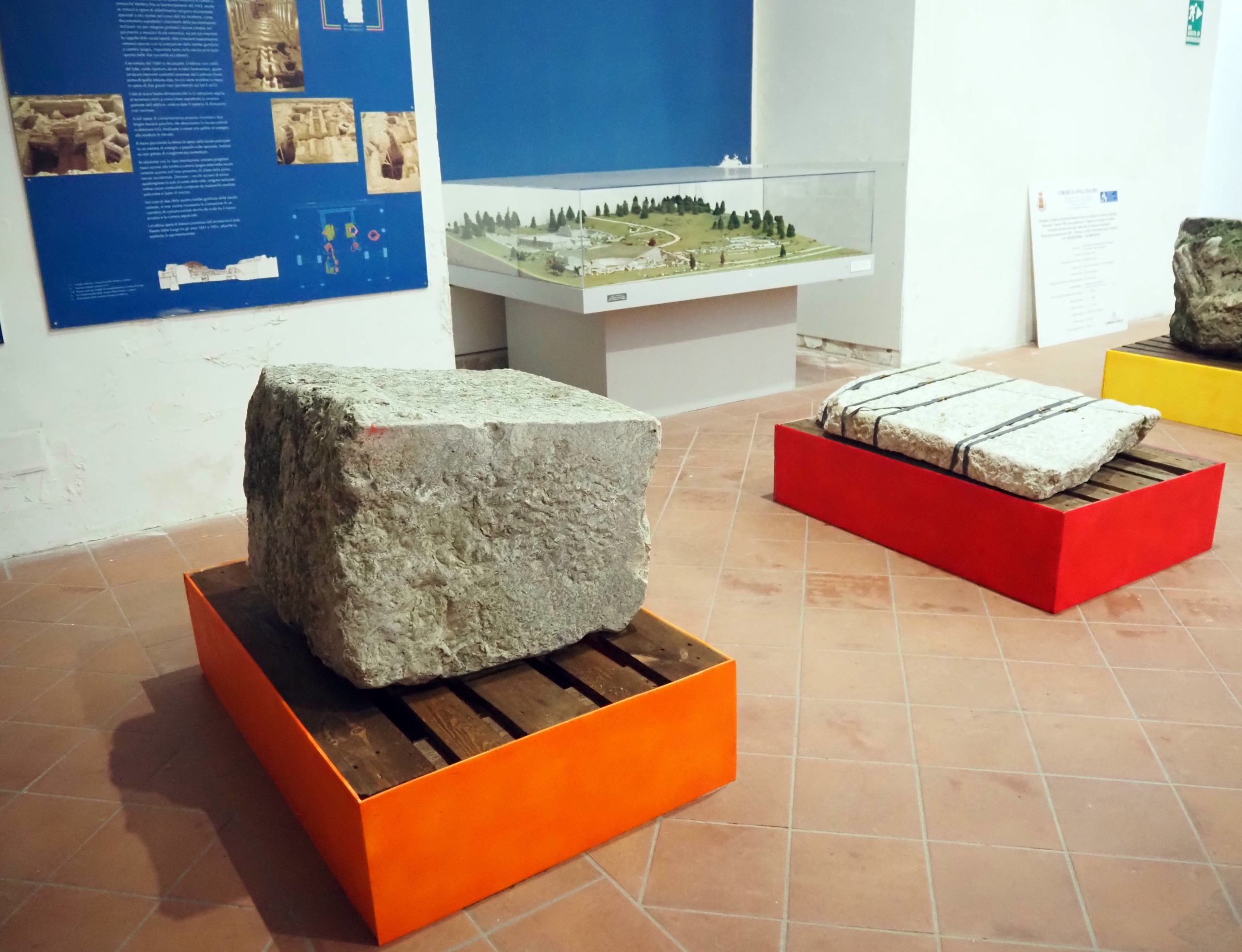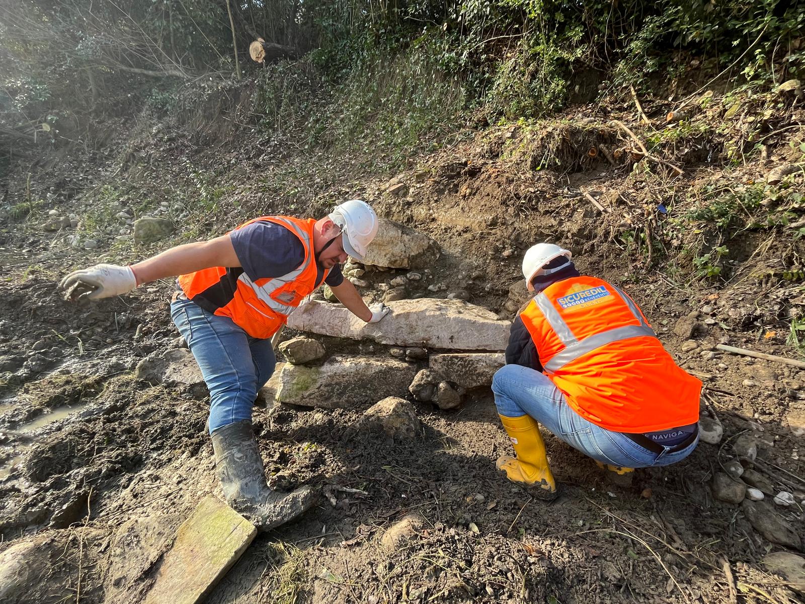 Nel settembre 2021, in seguito all’esondazione del torrente Serretelle nel territorio comunale di Apollosa (Benevento), è stato individuato un monumento funerario romano decorato con scene gladiatorie, databile ai primi decenni del I secolo d.C. Il mausoleo, smontato e reimpiegato in età medievale in un muro di contenimento degli argini fluviali, fu originariamente edificato lungo il tracciato dell’Appia che da Caudium conduceva a Beneventum. Dopo un primo recupero d’emergenza, nel 2025 – grazie ai fondi per progetti di ricerca del Ministero della Cultura – è stato possibile riportare alla luce circa 40 blocchi in calcare pertinenti alla struttura e programmare un intervento di ricomposizione del monumento presso la sede della Soprintendenza a Benevento. Il mausoleo, a tamburo su base a dado quadrangolare, presentava un diametro di circa 12 metri. Le cornici modanate e lo stile dei rilievi figurati consentono di datarlo ai primi decenni del I secolo d.C. Di particolare rilievo è il fregio con lo scontro tra tre gladiatori: al centro si riconosce un gladiatore di tipo sannita, identificabile dallo scudo ricurvo rettangolare, dai polpacci fasciati e dal cinturone decorato con motivi vegetali che trattiene il perizoma, nell’atto di affrontare un avversario munito di scudo. La presenza di una seconda figura suggerisce un ulteriore duello raffigurato nella scena. Il committente, verosimilmente un organizzatore o finanziatore di spettacoli gladiatori, volle così celebrare e tramandare la memoria dei combattimenti svoltisi nell’anfiteatro di Benevento. Le ricognizioni nell’area hanno inoltre permesso di individuare la camera funeraria, composta da vani quadrangolari affrescati, che sarà oggetto di prossime indagini archeologiche.