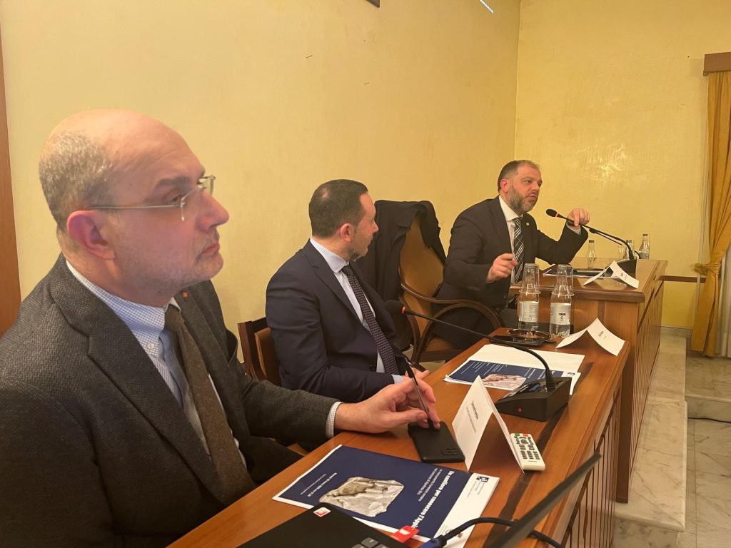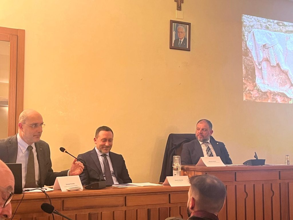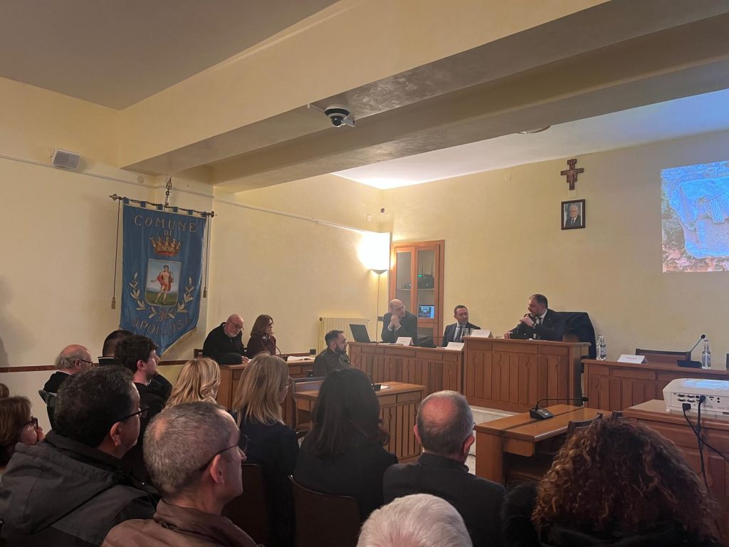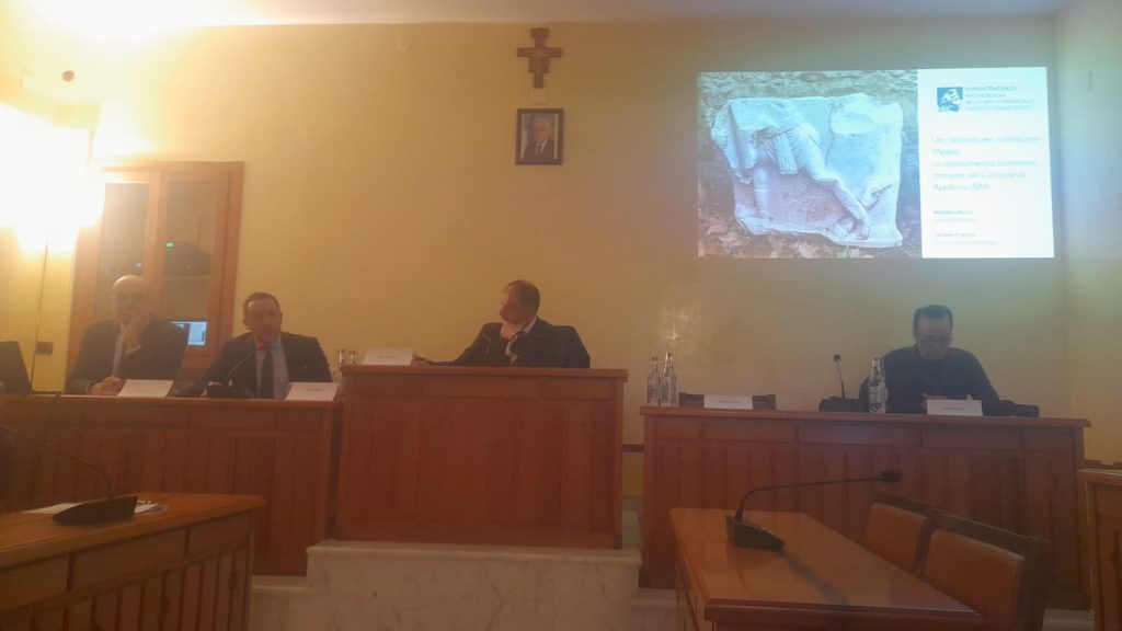 Folla alla conferenza stampa dal titolo “Un cantiere per conoscere l’Appia: un monumento funerario romano nel Comune di Apollosa”, nell’aula consiliare, per la presentazione di un importante ritrovamento e degli studi eseguiti dalla Soprintendenza Archeologia belle arti e paesaggio per le province di Caserta e Benevento. Il Soprintendente Mariano Nuzzo, in apertura, ha sottolineato l’importanza di condividere con la comunità le nuove scoperte e di metterle a disposizione dei cittadini, alla luce dell’eccezionale rilievo e della ricchezza dei particolari architettonici del monumento funerario decorato con scene di gladiatori. Ha spiegato come la tutela non si esaurisca nel recupero e nel restauro, ma punti a un chiaro obiettivo di valorizzazione, che coinvolga istituzioni e territorio – Soprintendenza, Comune e Provincia – in un percorso che includa anche la ricostruzione virtuale del monumento. In questo modo si aprono nuovi e significativi scenari di studio che hanno visto i reperti già conservati presso il Centro operativo di Benevento, visitabili su prenotazione. Il Soprintendente ha ringraziato il volontario Marco Zamparelli per il suo forte senso civico e per aver segnalato subito la scoperta alla Soprintendenza, ribadendo l’importanza della collaborazione tra cittadini e Istituzioni.