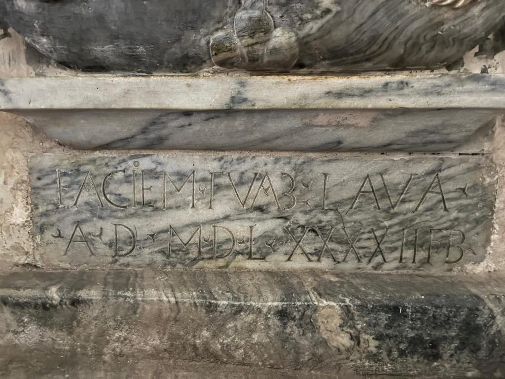 In sacrestia, sul lavabo utilizzato per l’abluzione prima di indossare le vesti liturgiche, c’è un’iscrizione che recita: “Faciem tuam lava” (Lavati la faccia) tratta dal Vangelo secondo Matteo 6:16-18 “Ma tu, quando digiuni, ungiti il capo e lavati la faccia, affinché non appaia agli uomini che tu digiuni, ma al Padre tuo che è nel segreto”.